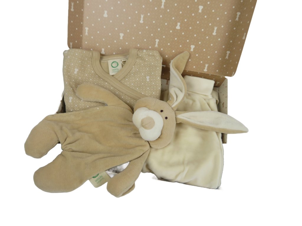 - Das Geschenkset enthält einen Babybody mit langen Ärmeln, eine weiche Velourshose mit breitem Bund und einen Hasen (Kuscheltier, das einen Schnuller halten kann).