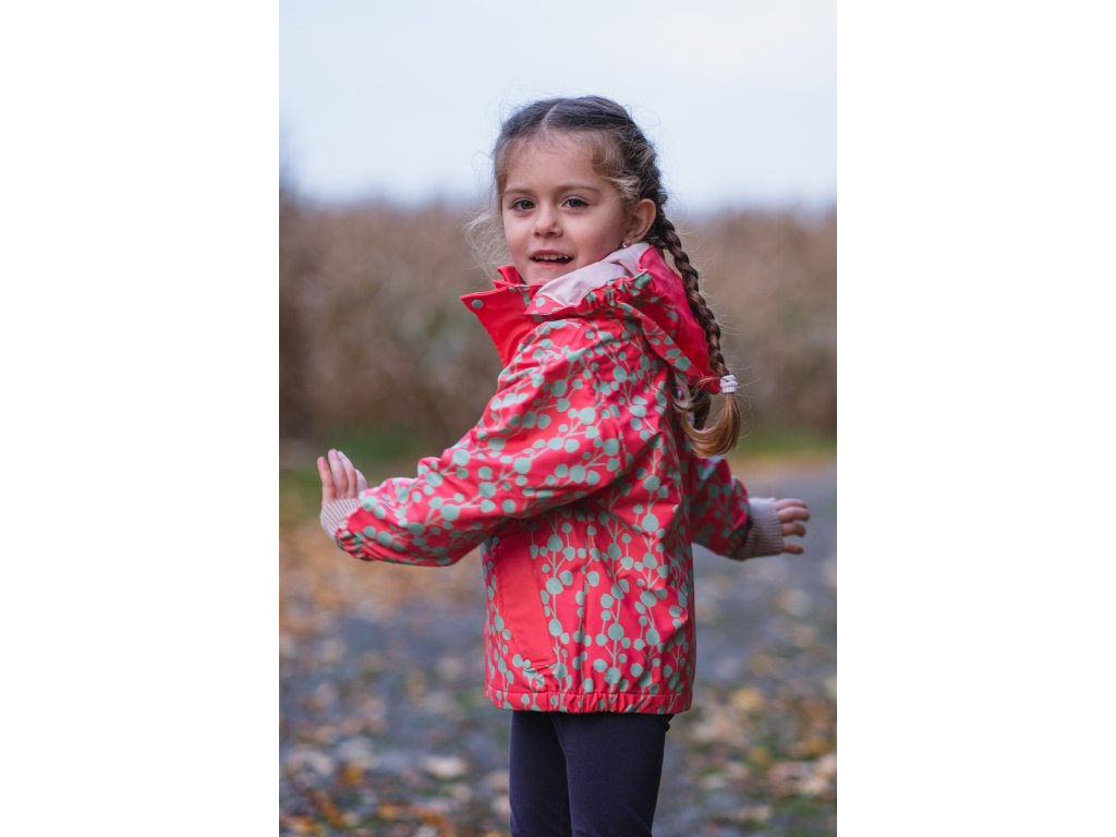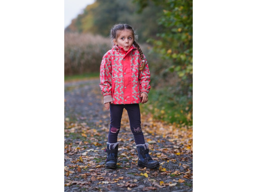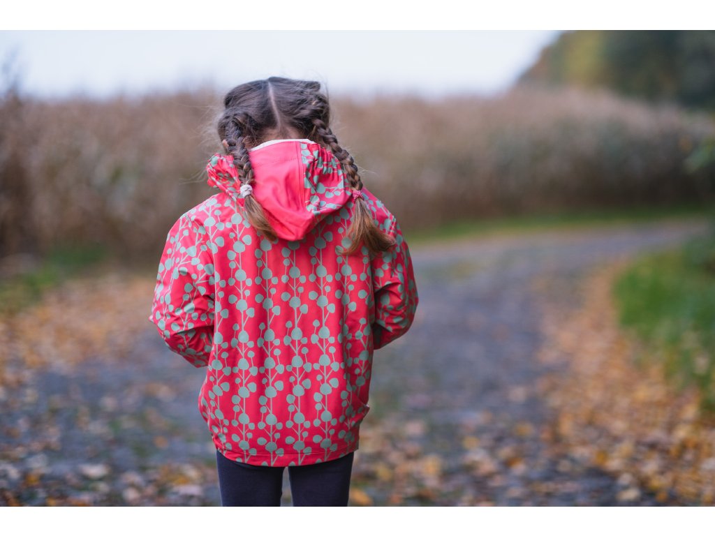 Ohne Isolierung. Die Jacke hat vorne zwei Taschen. Die Kapuze mit Schirm ist mit Druckknöpfen abnehmbar. Der Anzug ist leicht und bequem zu tragen bei schlechtem Wetter. Kinder sind vor Nässe und Wind geschützt. Die Kapuze ist abnehmbar. Die Hose hat verstellbare Hosenträger und unten einen Gummizug, der über den Schuhen verstellbar ist.