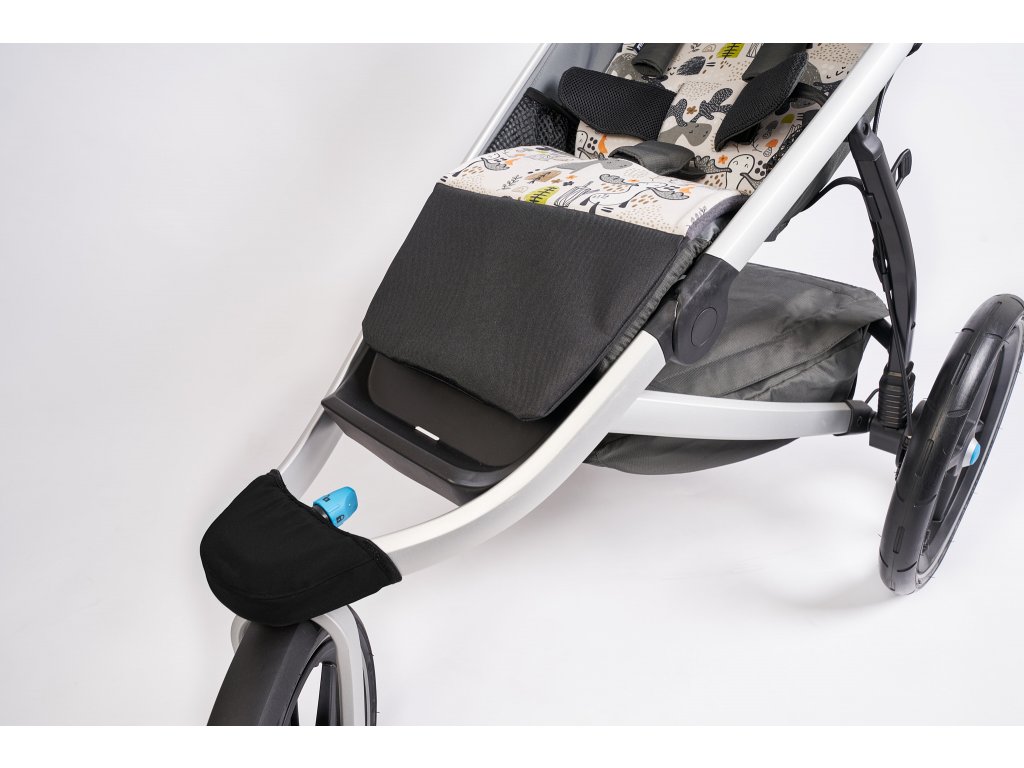 Die Schutzkappe für die Buggyradabdeckung des Kinderwagens Thule Urban Glide ist aus flexiblem und wasserabweisendem Material gefertigt, das sich den Kurven des Plastikteils sehr gut anpassen kann.